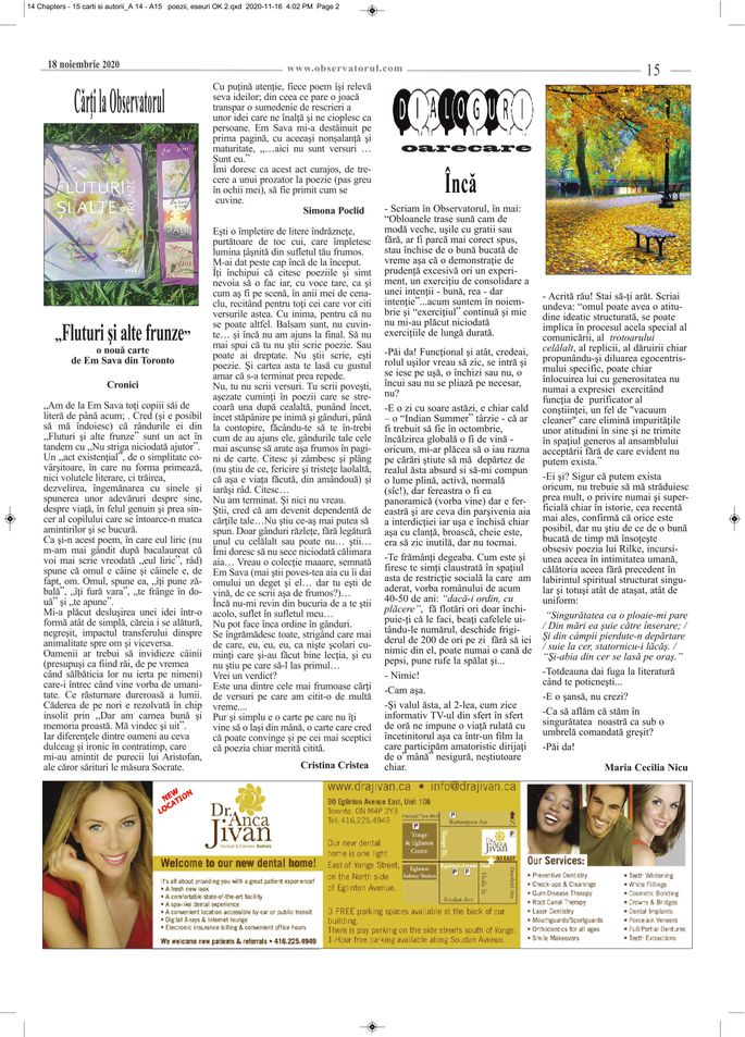 Toamna lui 2020 poartă mască. Ne e frig, ne e ciudat, ne e răbdare. Ne e grijă de cei de acasă, din țară. Câteva lucruri însă curg firesc. Observatorul de Toronto, ediția tipărită este unul din momentele culturale românești ce se întâmplă în marea metropolă. Luna aceasta, pe lângă obișnuitul articol – Em Sava (pagina 3), la prezentări editoriale este vorba despre volumul meu:„Fluturi și alte frunze”.