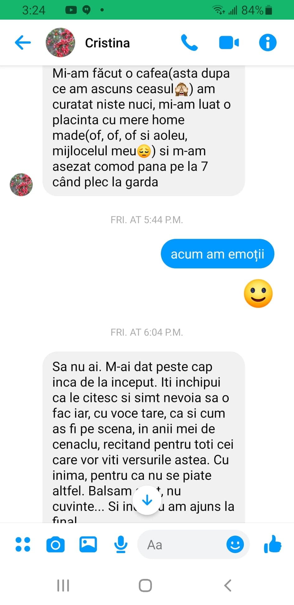 „Mi-am făcut o cafea (asta dupa ce am ascuns ceasul) am curătat niște nuci, mi-am luat o plăcinta cu mere home made (of, of, of si aoleu, mijlocelul meu) și m-am așezat comod până pe la șapte când plec la gardă.”